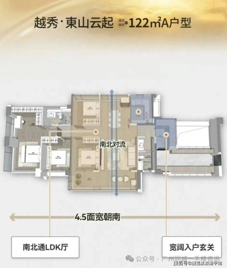 122平米户型采用横厅布局,全屋南北通透,还附赠了一个相当大的归家长廊,可以当做收纳空间。