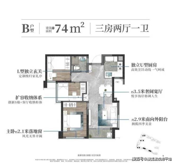 - 74㎡三房(150-160万):3.5米宽厅+U型厨房,预留双开门冰箱位,配备洗碗机,收纳空间翻倍;