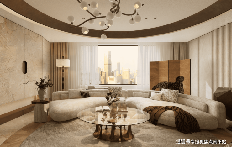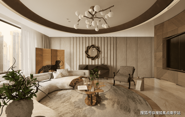 弧形吊顶与同色系的木质线条,弱化了空间棱角;米白色弧形沙发如云朵般包裹,搭配豹纹毛毯与豹子屏风,在克制中透出野性的高级;
