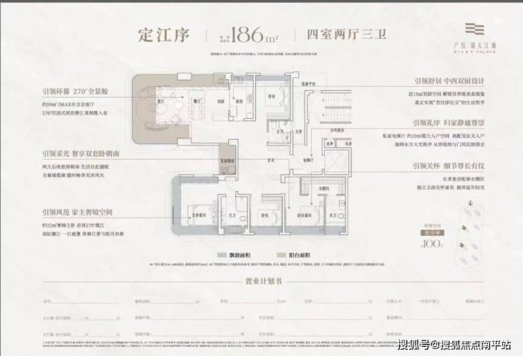 186平,这个户型最炸裂,双U景窗,瞰江效果佳,而且还是3房朝南,目前南昌有些瞰江户型,为了瞰江效果牺牲了通透性,这个很赞。