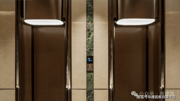 比如,杭州兴耀·月琉璃电梯厅采用剧院式的花苞形顶灯和美术馆式的射灯,营造出氛围感。Prada绿岩板被作为电梯轿厢之间的点睛之笔,与公共大堂的风格相呼应。仿古铜色电梯轿厢的金属质感,也为归家动线平添了几分高奢气质。