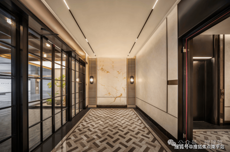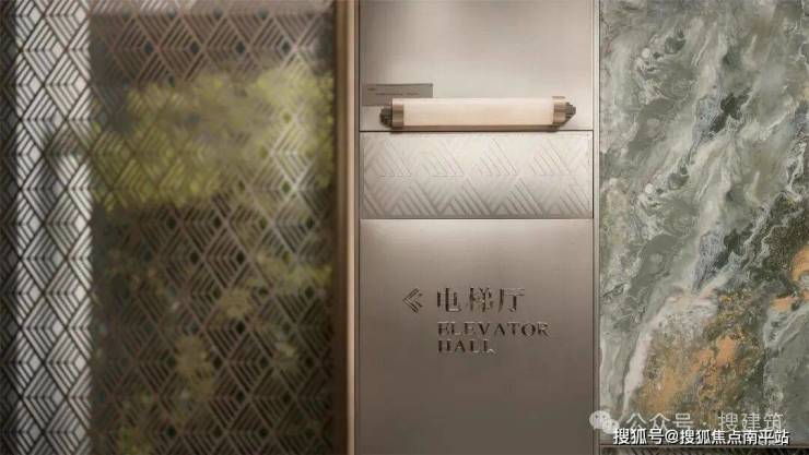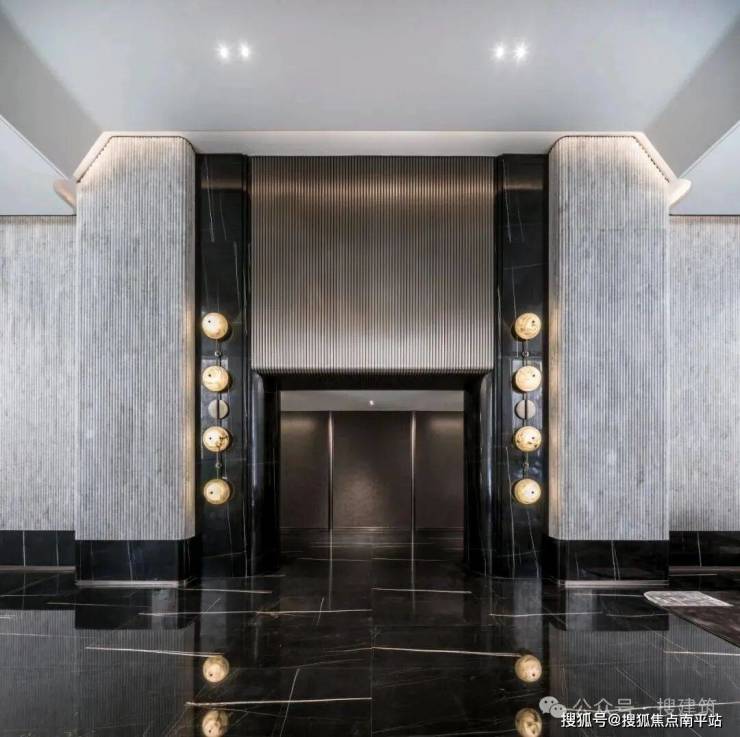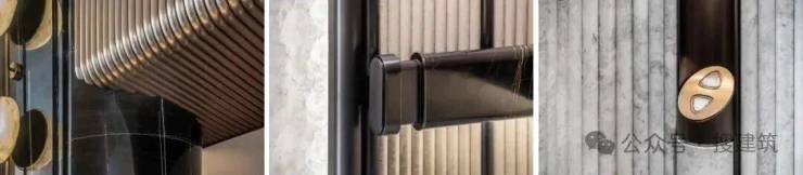 再比如,广州保利·珠江天悦,标准层侯梯前室都经过精细化处理。电井、管井、消防门板进行装饰处理只是基操,侯梯前室的装饰手法,根据栋型不同,形成审美风格变化,控制重复率,颗粒度非常细密。