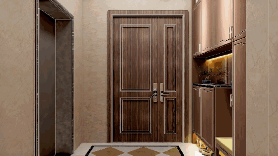 阔绰私属电梯厅;定制铸铝装甲门,配以名家定制图案,集成华为智能门锁定制门牌号,采用非遗传承大师亲手锻錾的纯铜门牌,尊崇感满满。