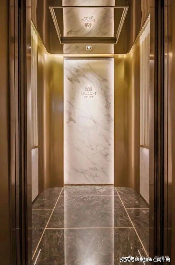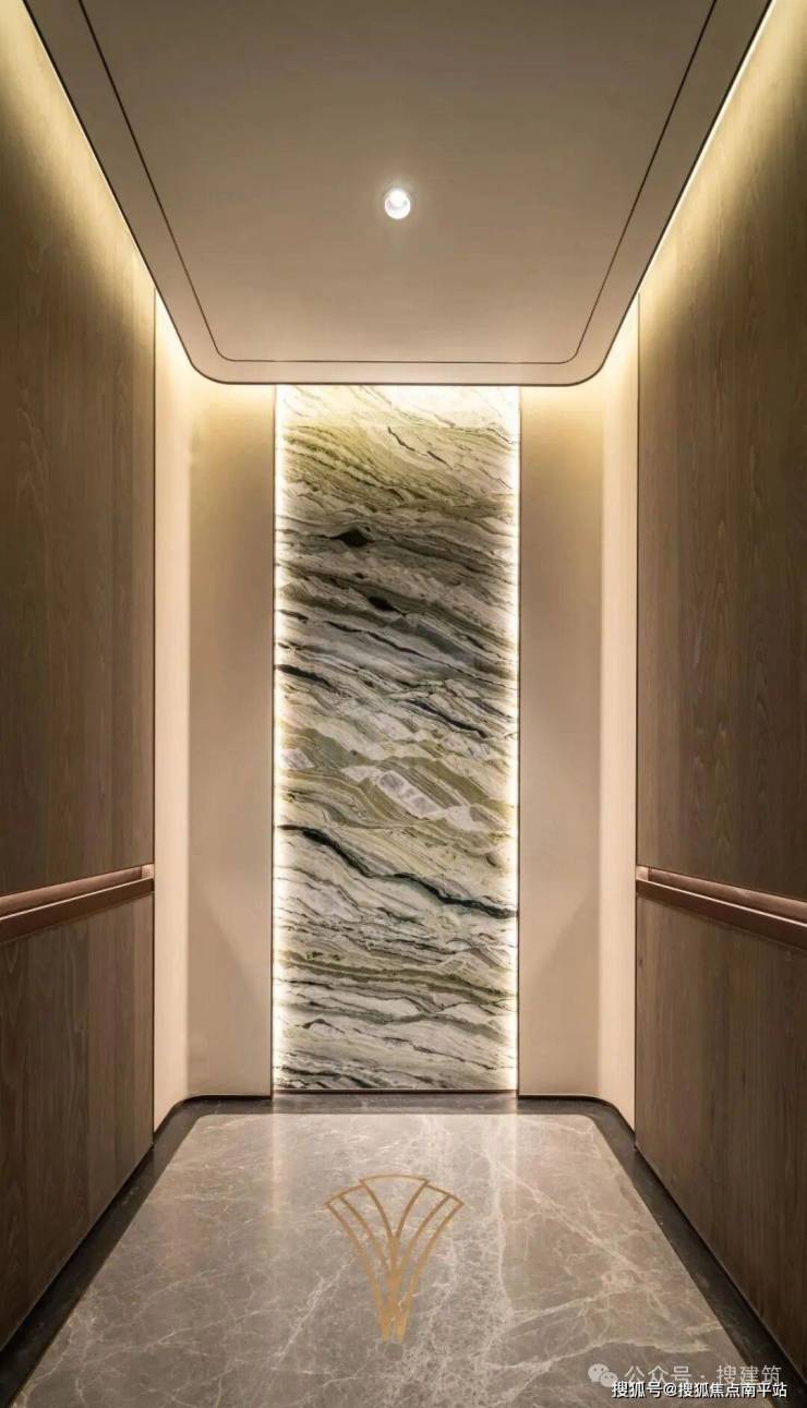再比如,杭州绿城·芝澜月华电梯厅毫不吝啬地使用云中翡翠石材和金属进行装饰,电梯门采用蚀刻暗纹的手法打上了项目logo。轿厢内部的云中翡翠石材搭配木饰墙面,和镶嵌着金色logo的石材地面,在环绕的灯带装饰下,极尽高级感。