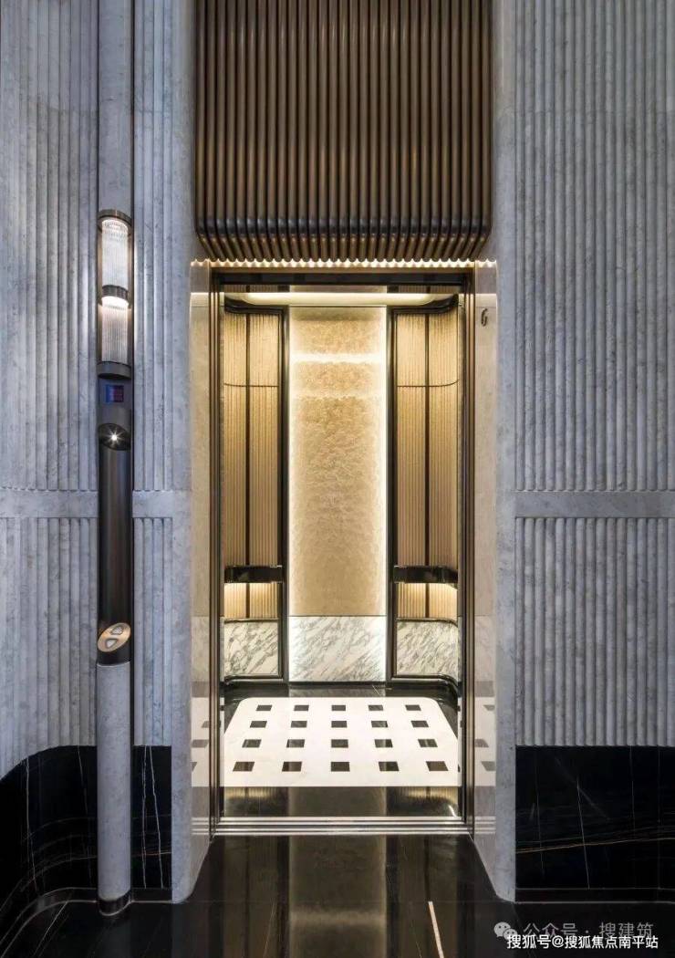 大户型电梯轿厢,本身得益于层高的空间,2.6米的轿厢尺度感就甚为惊人,叠加大量的石材,软包,非常优秀的设计。