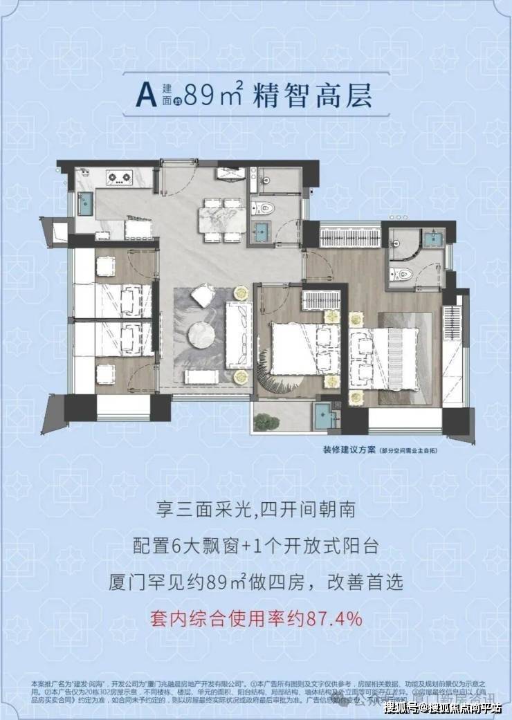 新Y字型楼栋设计,营造户户三面采光的通透格局,89㎡的户型设计把空间做到了极致,两梯三户+四房。全屋六大飘窗+1个开放式阳台约87.4%综合使用率,以及120㎡以上第四代产品享空中花园,洋房户户带入户花园,2-4楼额外配置晒台。